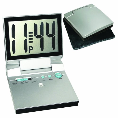 Matte Silver And Black Large Display Lcd Alarm Clock With Light And Snooze. Comes With Pouch For Easy Travel.